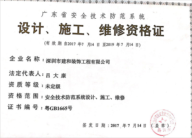 熱烈祝賀我司喜獲“廣東省安全技術防范系統(tǒng)設計、施工、維修資格證”
