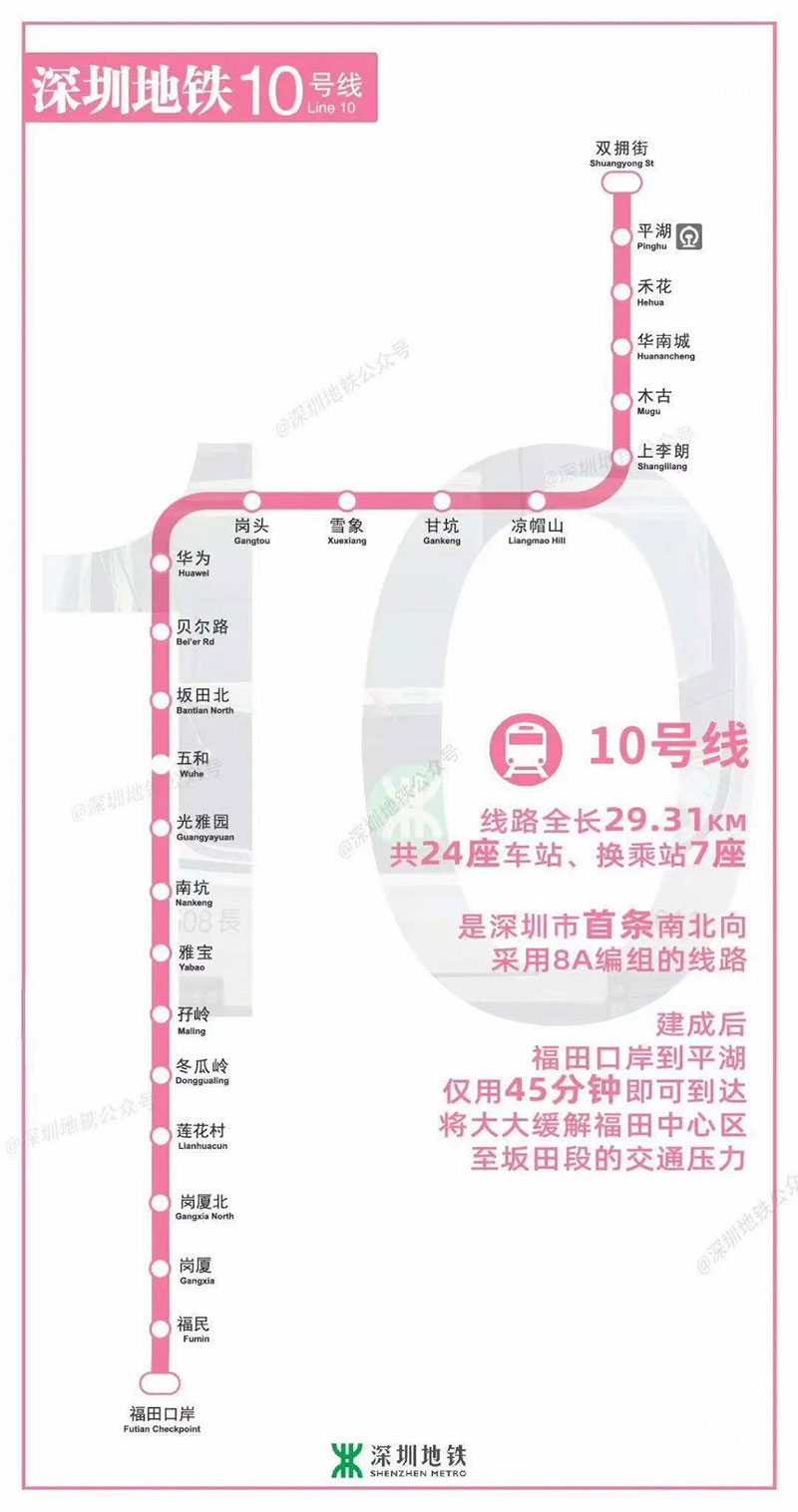 深圳地鐵10號線南連與香港毗鄰的福田口岸站,北接龍崗區(qū)的平湖樞紐,全長32.5公里,是深圳市中部發(fā)展軸的重要線路。通車后,市民乘地鐵由福田口岸到平湖僅需45分鐘。